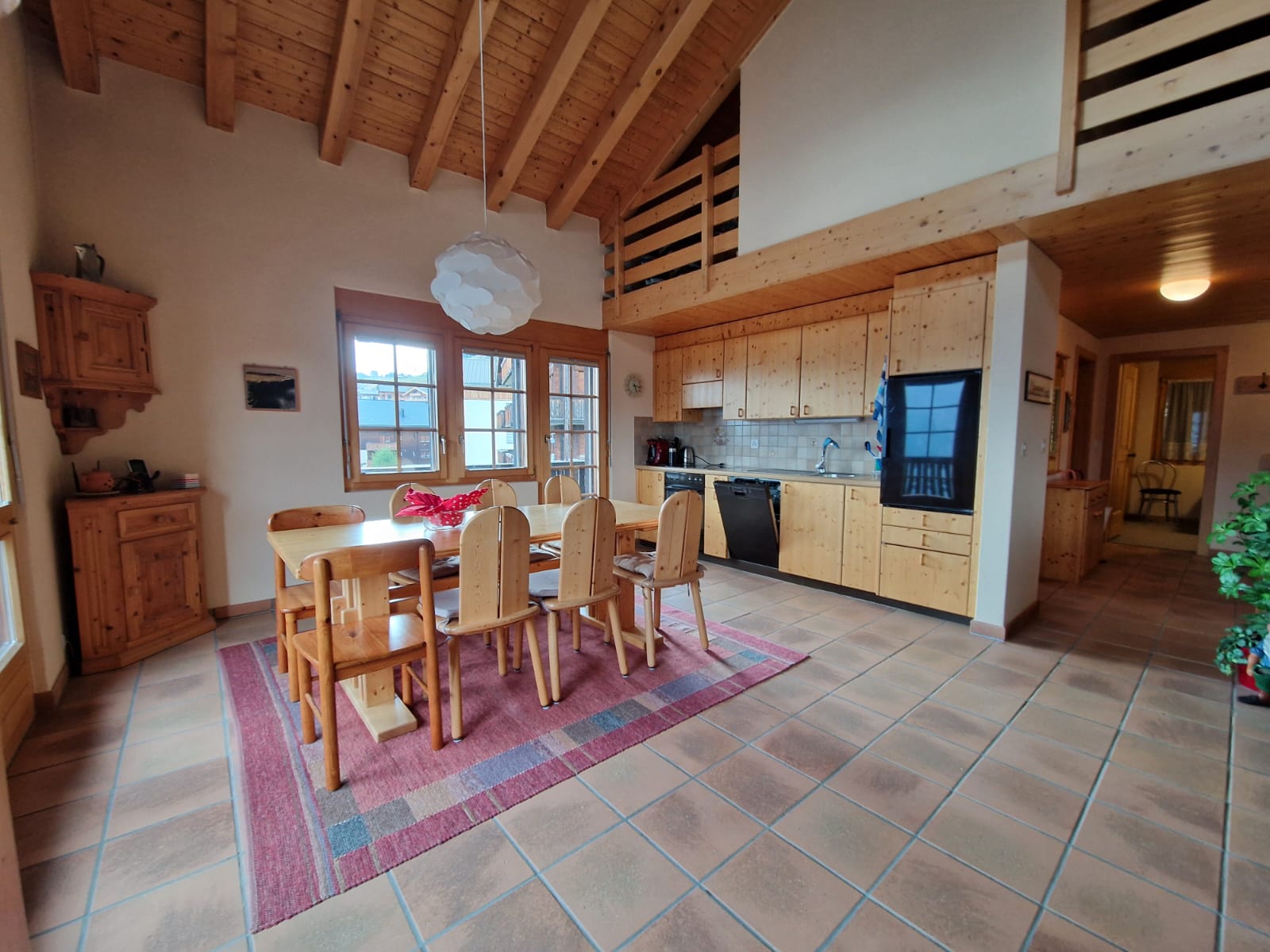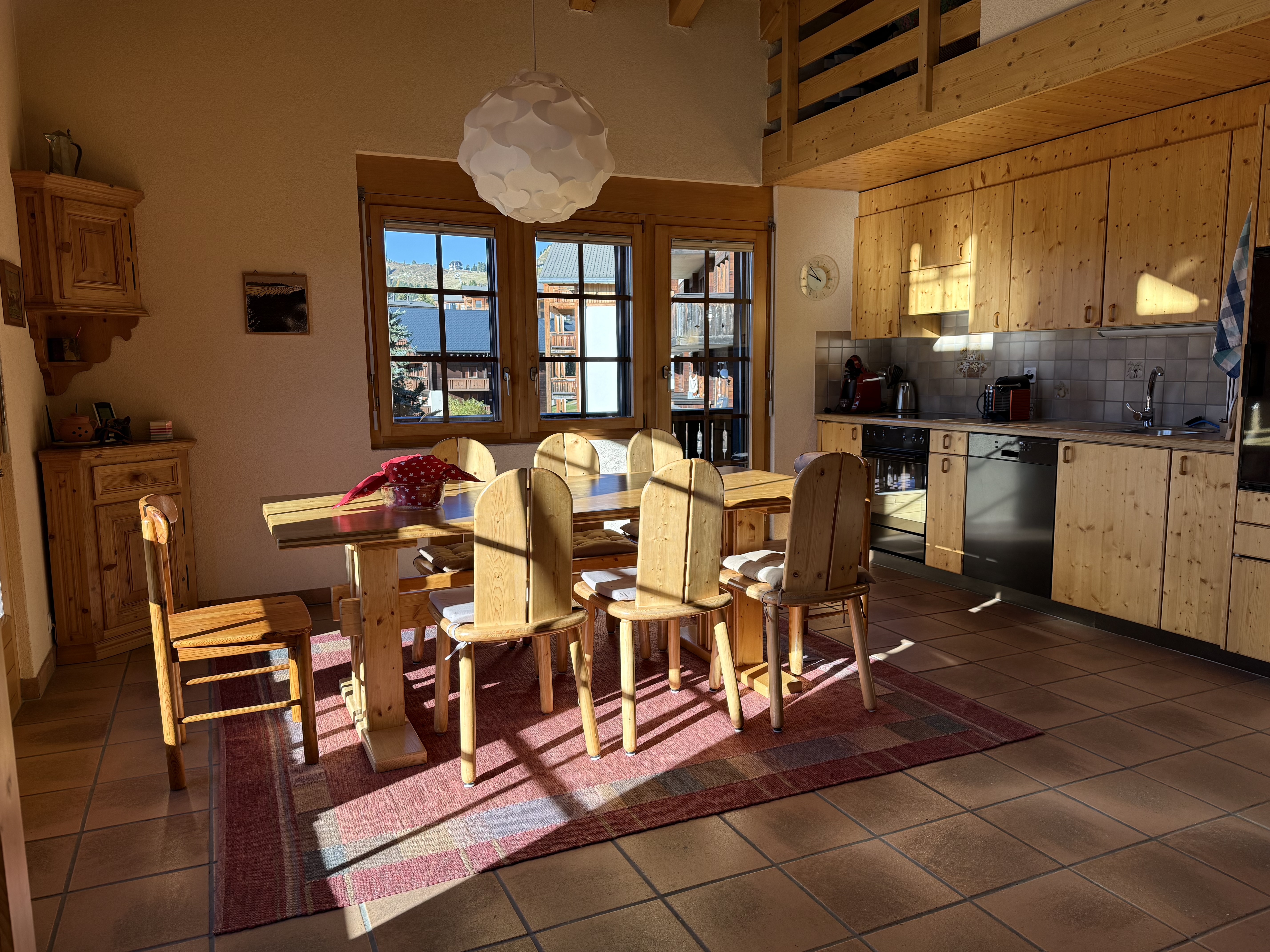 - Der offene und großzügig geschnittene Wohn-/Essraum hat eine Küchenzeile (mit Geschirrspüler, Racletteofen, Käsefondueset, Ceranfeld, Backofen, Toaster, Nespresso-Kapselmaschine und Wasserkocher), einen großen Esstisch und eine bequeme Sitzgruppe